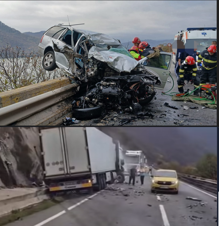 Momentul în care un autoturism condus de o femeie, care era cu doi copii minori în mașină, intră frontal într-un tir a fost surprins...