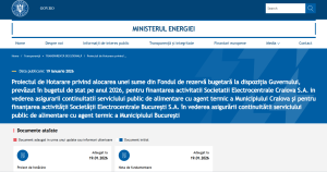 ”Se aprobă suplimentarea bugetului Ministerului Energiei pe anul 2026, cu suma de 30.000 mii lei credite de angajament si credite bugetare, la capitolul Capitolul 81.01, Titlul 55 ”Alte transferuri”- alineatul 55.01.46 „Transferuri către întreprinderi în cadrul schemelor de ajutor de stat”, din Fondul de rezervă bugetară la dispoziţia Guvernului, prevăzut în bugetul de stat pe anul 2026, pentru finantarea activitatii Societatii Electrocentrale Craiova S.A., in insolventa, in vederea asigurarii continuitatii serviciului public de alimentare cu agent termic a Municipiului Craiova”, se arată în documentul postat pe site-ul Ministerului Energiei.