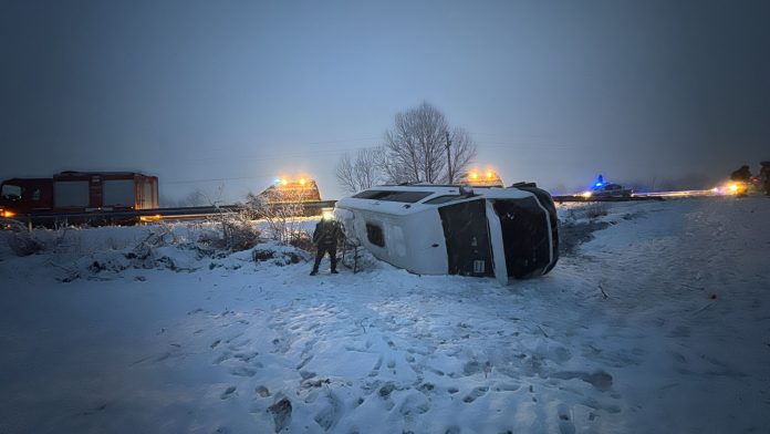 Microbuzul s-a răsturnat în afara părții carosabile. Din imaginile surprinse la fața locului se observă microbuzul răsturnat pe o parte, în afara drumului, într-o zonă acoperită de zăpadă, în timp ce autospeciale de intervenție și echipaje de poliție se află în apropiere, cu semnalele luminoase pornite.