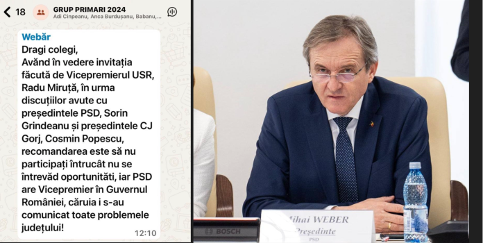În mesajul transmis pe grupul de whatsapp, liderul PSD Gorj, Mihai Weber, le-a transmis primarilor că a discutat cu președintele partidului, Sorin Grindeanu și cu șeful administrației județului și le recomandă să nu participe la discuțiile cu Radu Miruță, spunând că ”nu se întrevăd oportunități”. Weber le-a spus edililor nemulțumiți, că problemele din Gorj au fost deja comunicate vicepremierului pe care PSD îl are în guvern. ”Având în vedere invitația făcută de vicepremierul USR, Radu Miruță, în urma discuțiilor avute cu președintele PSD, Sorin Grindeanu și președintele CJ Gorj, Cosmin Popescu, recomandarea este să nu participați întrucât nu se întrevăd oportunități, iar PSD are vicepremier în Guvernul României, căruie i s-au comunicat toate problemele județului”, este mesajul transmis primarilor, de deputatul și liderul PSD Gorj, Mihai Weber.